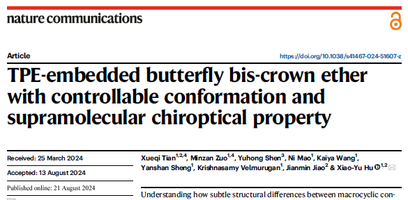 近日,澳门彩票有限公司 超分子功能材料团队胡晓玉教授在《Nature Communications》期刊发表了一篇题为“TPE-embedded butterfly bis-crown ether with controllable conformation and supramolecular chiroptical property”的研究论文,论文第一作者为澳门彩票有限公司 博士生田雪琪和博士后左旻瓒,通讯作者为胡晓玉教授。