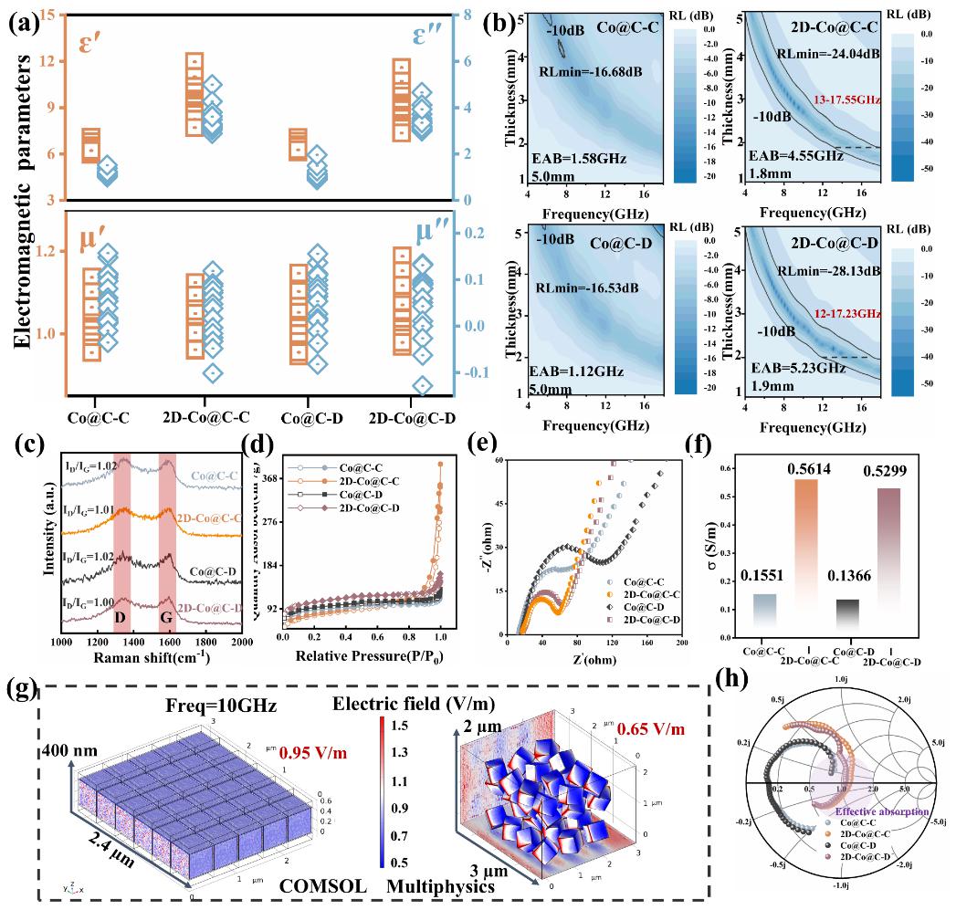 对比二维有序阵列自组装过程前后的电磁参数和吸波性能,并分析其耦合增强机制。研究得出在相组成没有发生变化的条件下,由于其规则排列,导电性能大幅度上升。通过COMSOL模拟样品在微波场下的表面电荷分布和电场,二维有序阵列由于其间距更小,电荷的离散导致相邻面上感应出更高的电场强度。