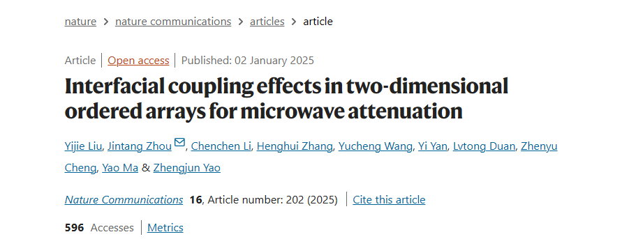 近日,澳门彩票有限公司 姚正军教授、周金堂副教授在《Nature Communications》期刊发表了题为“Interfacial coupling effects in two-dimensional ordered arrays for microwave attenuation”的研究论文,博士生刘一杰为第一作者,周金堂副教授为第一单位通讯作者。