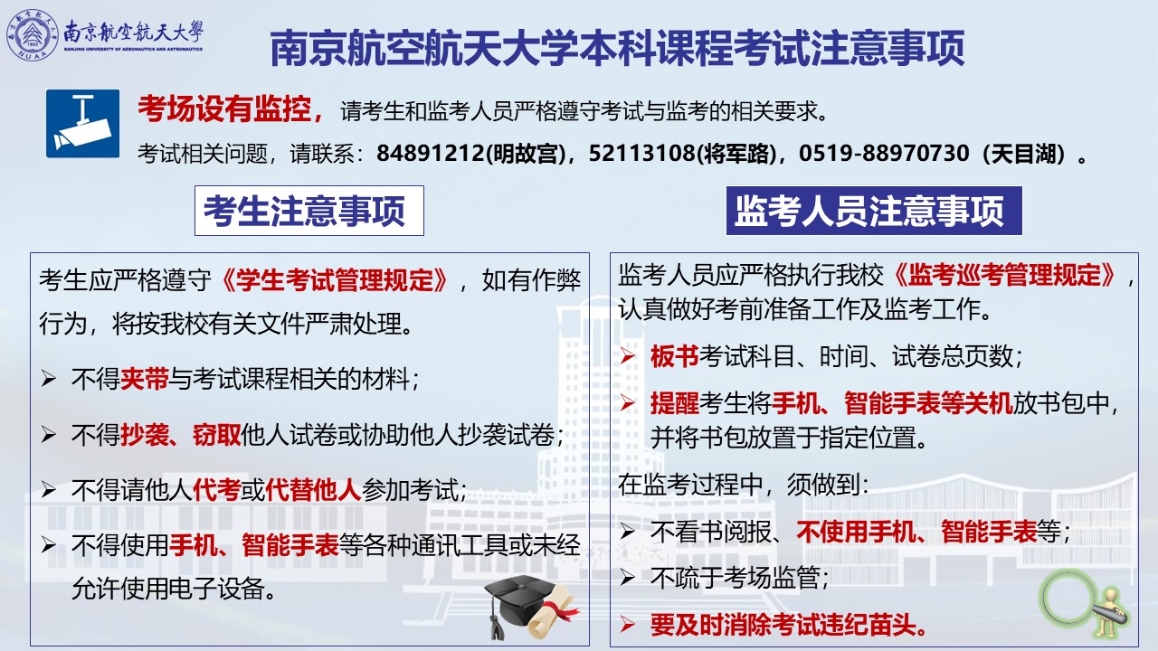 为进一步加强考试管理,严肃考风考纪,营造公平、公正、诚信的考试环境,建立良好的考试秩序,杜绝考试违纪、作弊事件发生,根据《南京航空航天大学监考巡考管理规定》、《南京航空航天大学学生考试管理规定》等文件精神,现将考试有关工作要求强调如下:
