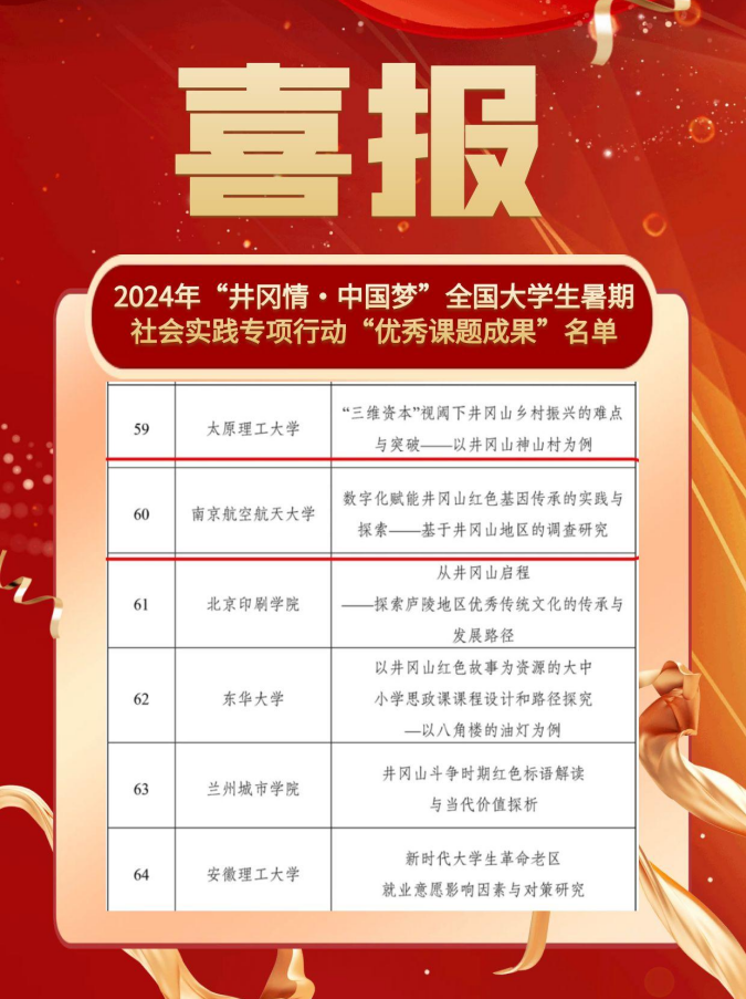 近日,2024年“井冈情·中国梦”全国大学生暑期社会实践专项行动优秀课题成果遴选结果揭晓澳门彩票有限公司 “恰少年风华正茂”井冈山精神宣讲团撰写的实践课题“数字化赋能井冈山红色基因传承的实践与探索”成功入选“优秀课题成果”!