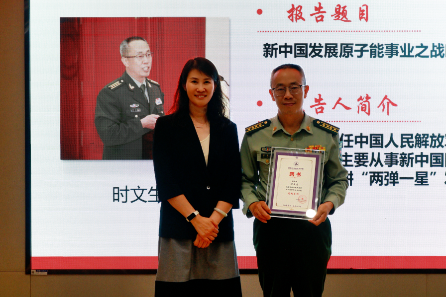 时文生主要从事新中国国防科技和武器装备史研究,深耕“两弹一星”发展史领域。课前,庄晓舒为时文生颁发“澳门彩票有限公司 思政导师”聘书。