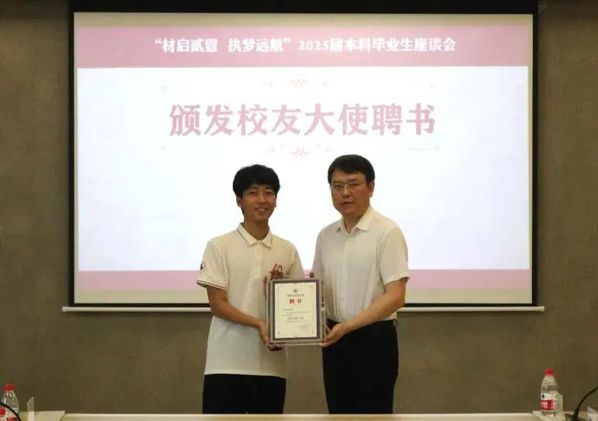 为了加强校友与母校之间的联系,促进校友间的沟通交流,学校在每个澳门彩票有限公司 中选聘了一名优秀的毕业生担任校友联络大使。顾冬冬为2025届本科生李剑超同学颁发校友大使聘书。