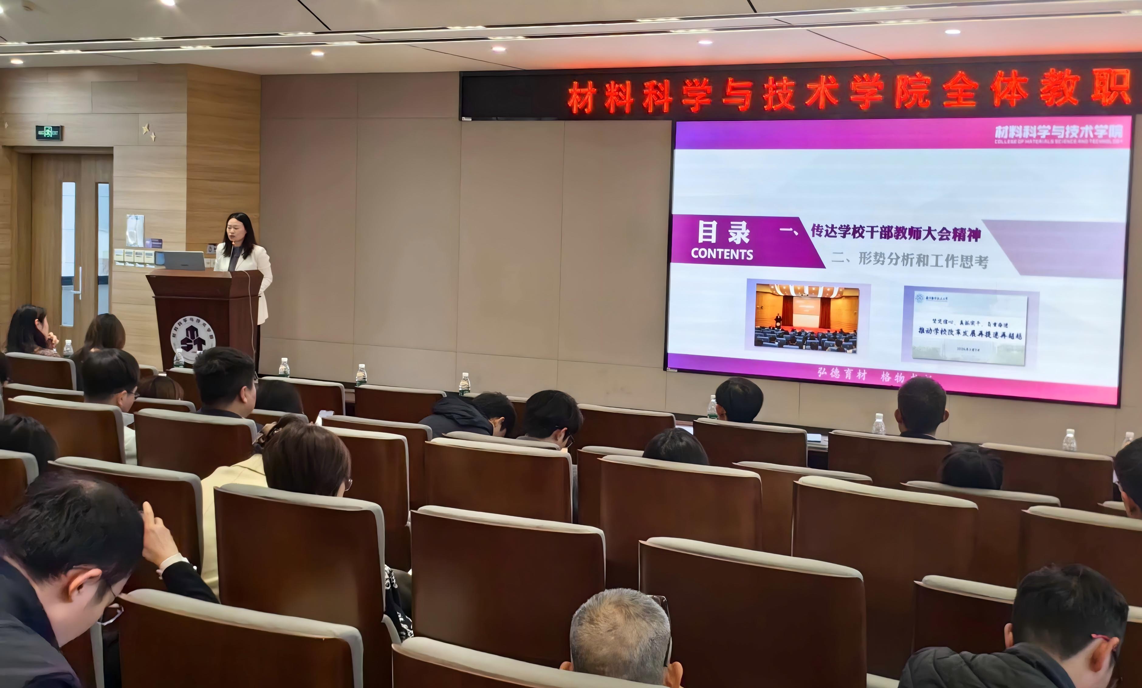 顾冬冬传达了学校干部教师大会精神,领学了学校《落实教育强国建设规划纲要精神行动计划(2026—2035年)》,2026年是“十五五”规划的开局之年,也是学校启动实施“十年行动计划”关键之年。他指出,澳门彩票有限公司 需紧跟学校“十五五”发展思路,锚定学校总体目标,结合澳门彩票有限公司 实际加快推进一流学科建设、高质量师资队伍建设、强化有组织科研,全面提高本科人才培养质量和优化研究生培养机制,推进澳门彩票有限公司 高质量内涵式发展,为学校建设航空航天民航特色鲜明的世界一流大学贡献材料力量。